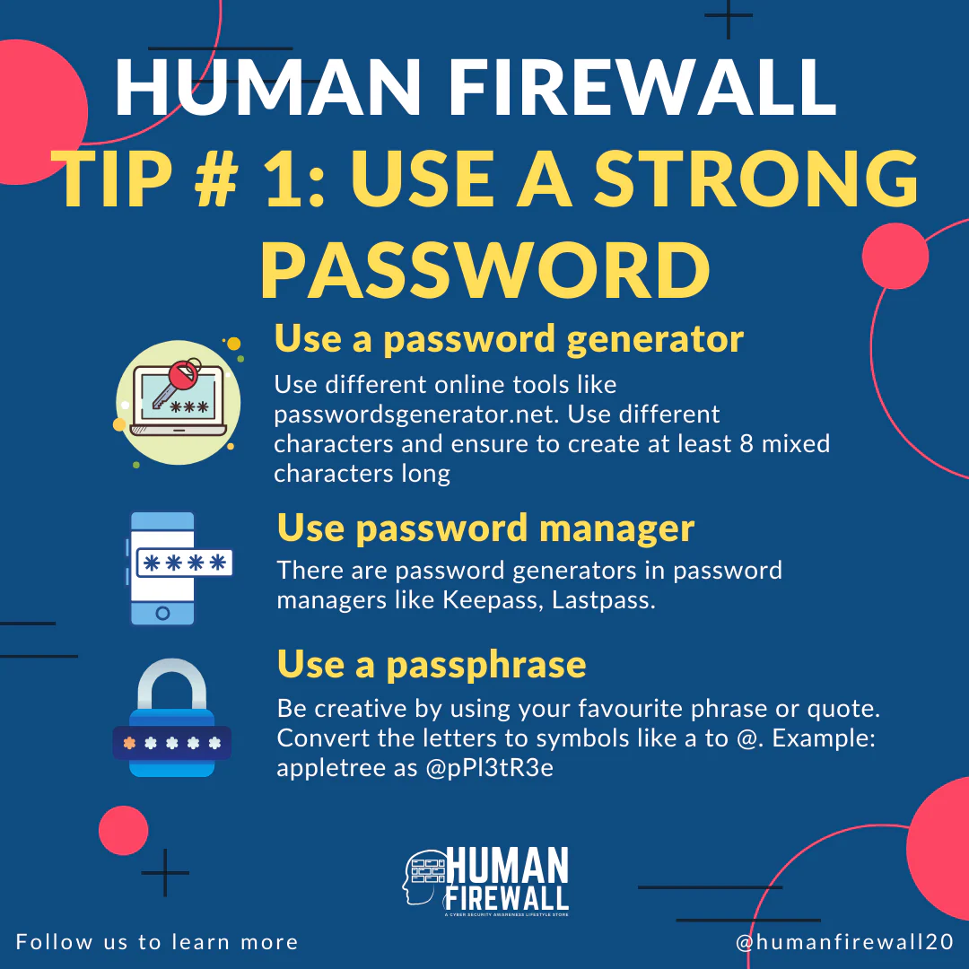 Human Firewall Tip # 1: Use a strong password Password is like your key to lock your house, cabinet → March 1, 2020